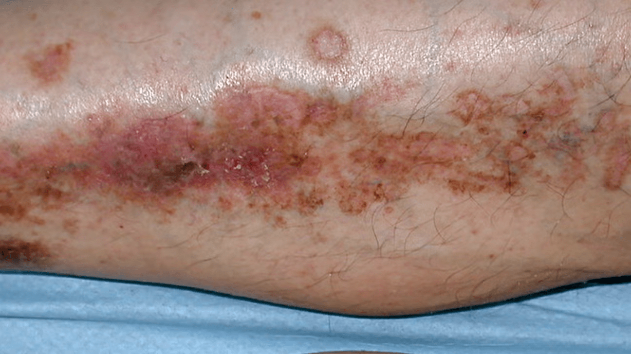 Reddish-brown or yellowish patches, often on the shins, with a waxy center and visible blood vessels.